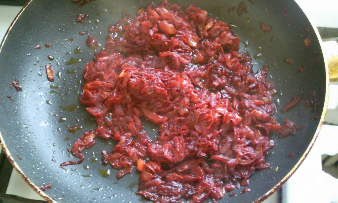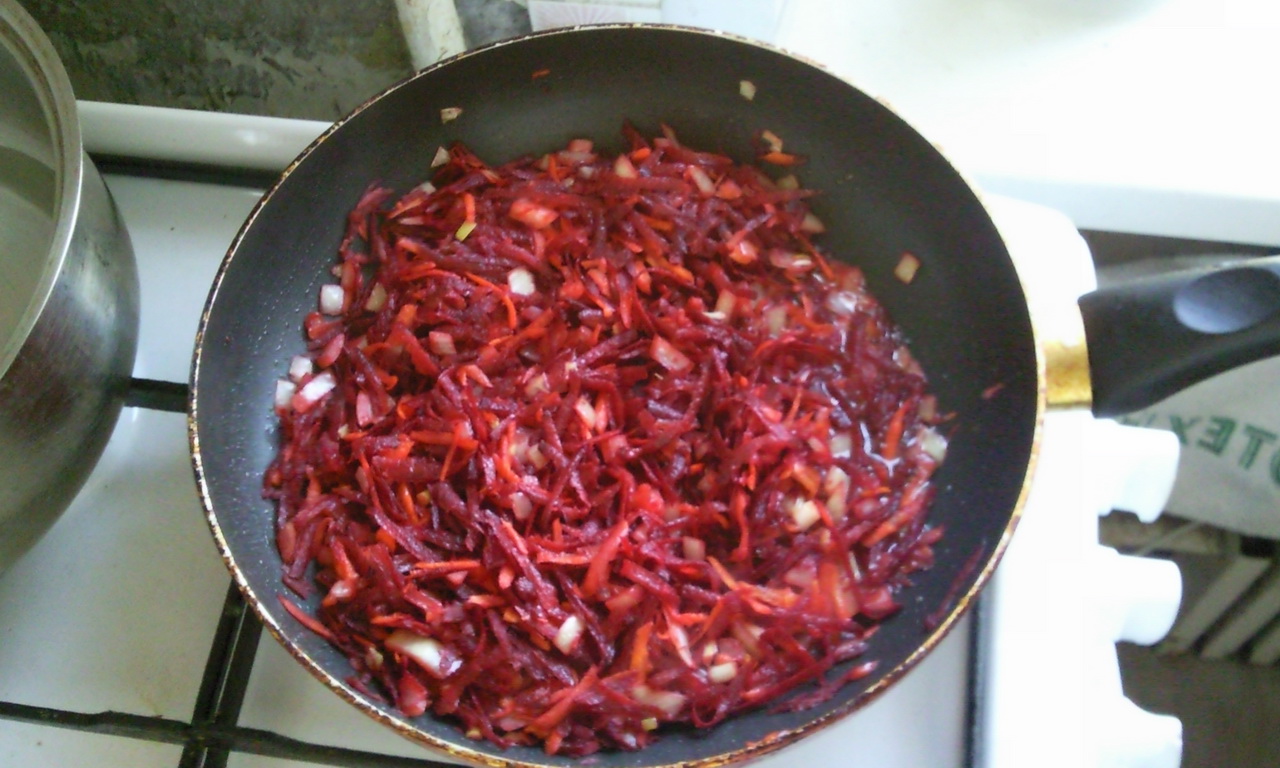 Делаем зажарку: в подсолнечном масле обжариваем лук, морковку и свеклу. Сам я не люблю или даже презираю использование зажарки, но так как это постный борщ, то без нее никак. Сначала без крышки, потом накрываем крышкой. Можно подсолить, добавить немного воды и уксуса. Перед тем как будете выключать свекла должна быть почти готова.