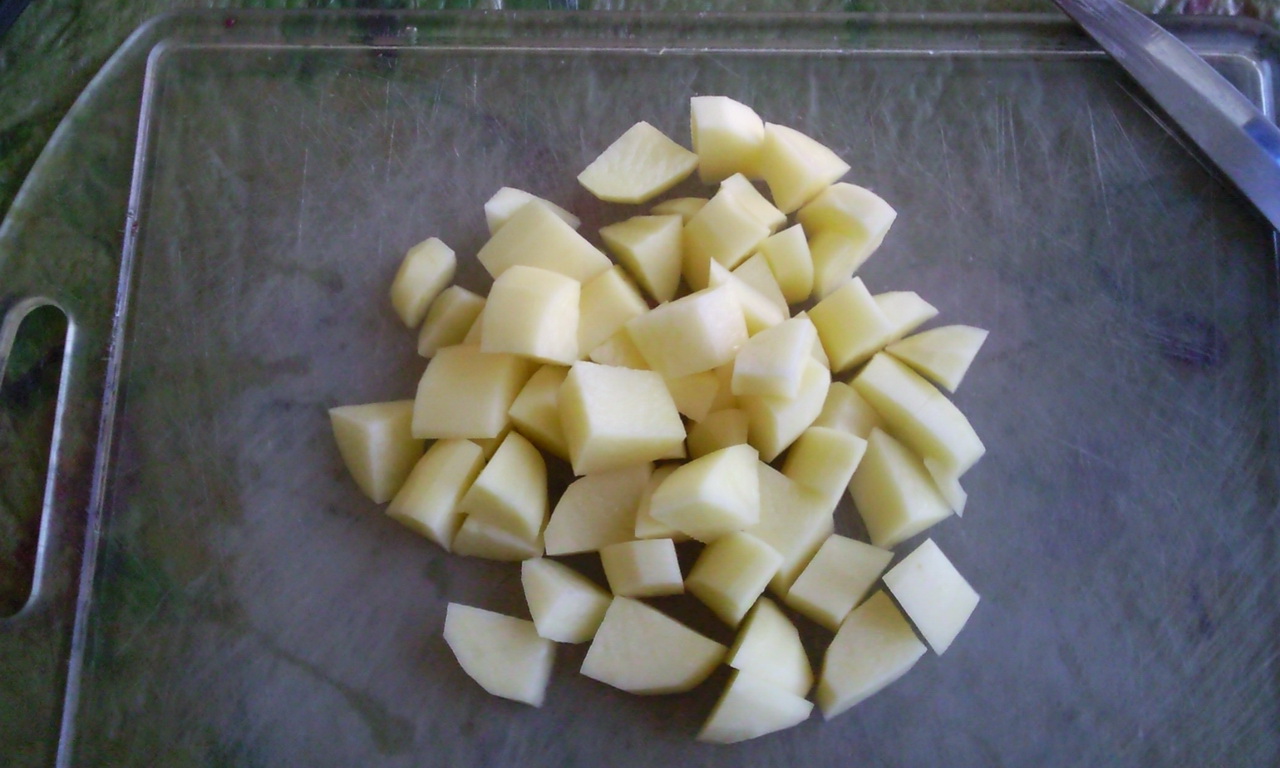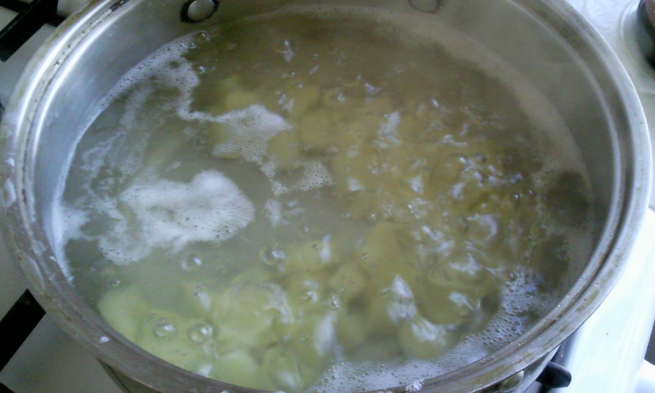 Пока делается зажарка - мы уже должны были поставить кастрюльку воды. Как закипит - посолить и опустить в нее картошку. Пенку с картошки ессно нужно снять