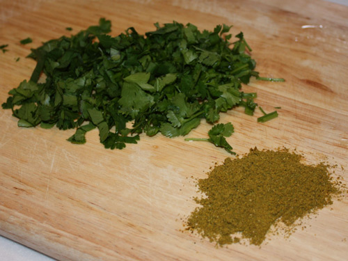 Здесь тонкий момент, обратите внимание на стакан, уксуса достаточно много. Этого боятся не надо, полученная смесь должны быть достаточно острой, иначе курица в последствии будет слишком пресной. Далее мелко режим кинзу и берем специи – обычно это немножко гвоздики, хмели-сунели или что-то похожее (я опять таки рекомендую консультироваться с торговцами специями на рынке и не в коем случае не брать расфасовки в магазине):