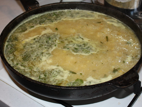 Интенсивно перемешиваем, чуть-чуть поджариваем и заливаем полученную смесь бульоном, который остался после варки курицы. Бульон обычно остается, не надо его весь вливать. Остатки бульона можно употребить на следующий день в качестве лекарства от тяжелого похмелья.