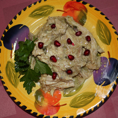 Ждем когда емкость остынет и ставим в холодильник на 12 часов минимум, а лучше на сутки. Вообще говорят, что сациви, чем дольше стоит – тем вкуснее, но всерьез проверить это никому не удавалось. )) Готовый, загустевший продукт выкладываем на тарелку или в миску, украшаем веточкой зелени и гранатовыми зернами. А ежели для себя, а не для романтического ужина с дефкой, так можете и не украшать ничем. В общем, приятного аппетита: