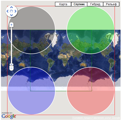 Теперь нужно по карте нарисовать круг. Круги рисуется обычно по двум параметрам: центр и радиус. Пока центр круга и центр карты совпадают и радиус круга не больше чем ширина карты. Проблем особы нет даже если круг стоит в углу (левый верхний) карты и имеет радиус в ширину карты. В такой ситуации есть часть круга которая попала на карту - одна четвертая круга, и часть круга которая нарисовалась за картой - три четвертых. Все красиво все работает.