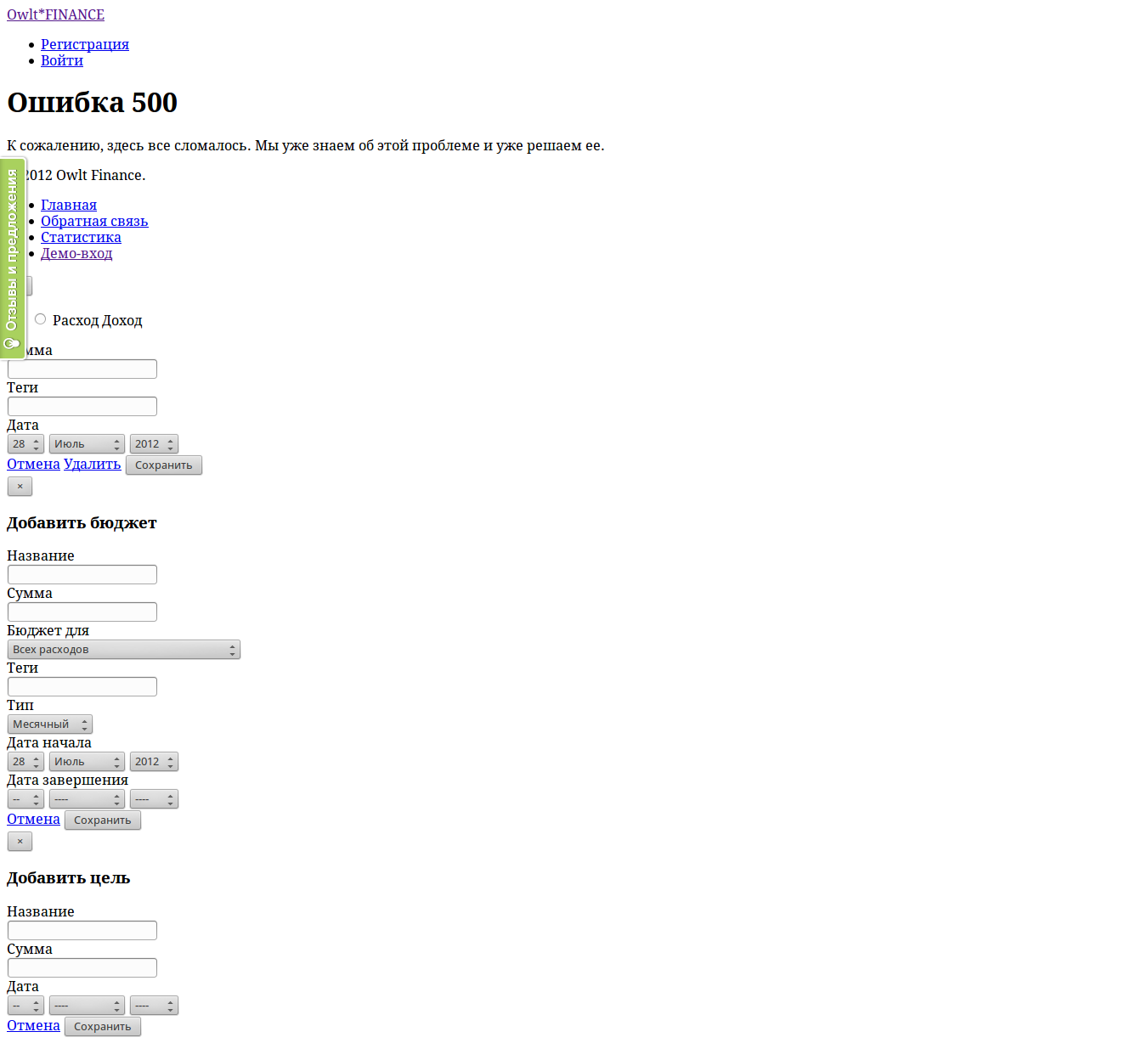 http://www.owlt.ru/ - сервис управления личными финансами. Контроль доходов, расходов, бюджеты, цели. В общем смотрим +)Спустя 135 сек.Поломались тут http://www.owlt.ru/ulogin/postback/?next=http://www.owlt.ru/accounts/logout/