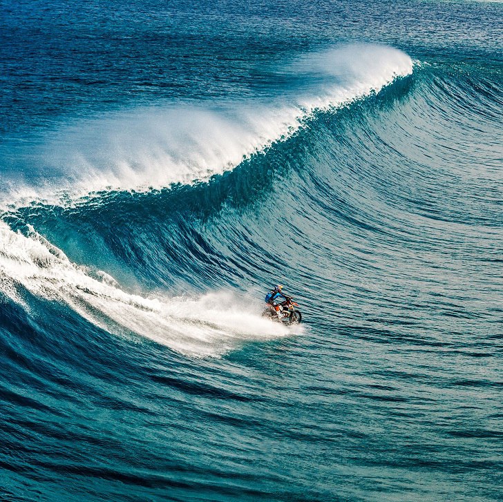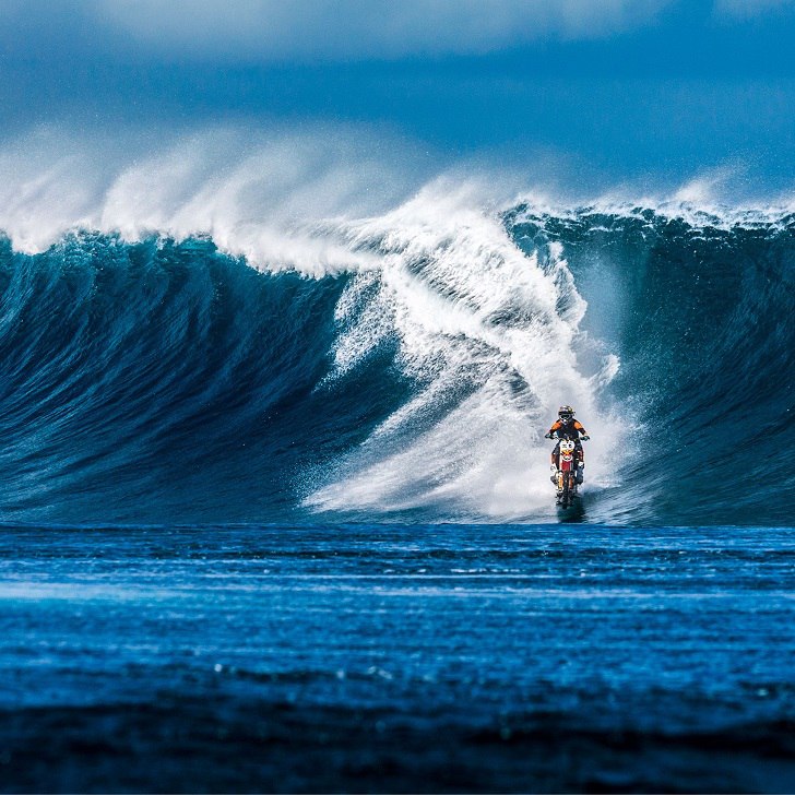 я когда смотрю у меня адреналин капает. ведь он остается на поверхности только пока удается поддерживать скорость. чуть замешкается или волна накроет ведущее колесо и ппц — как минимум эндуро потеряет. если вообще не утонет в своей амуниции.